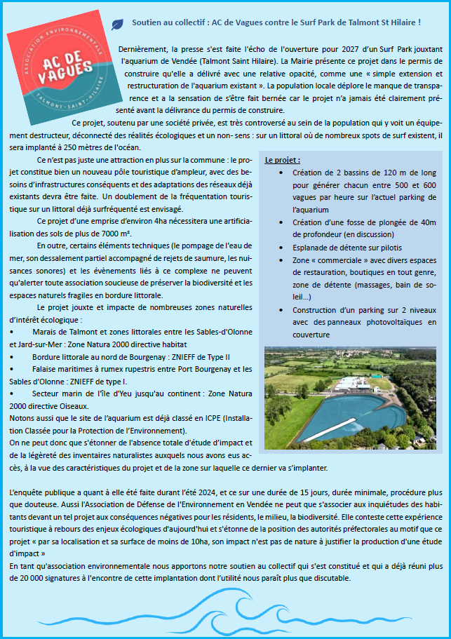 La ville de Talmont Saint Hilaire, en Vendée souhaite créer un surf park à 200m de la plage. Et bien évidemment cela pose question quant à son utilité mais surtout sur la biodiversité environnante qui y est très riche.